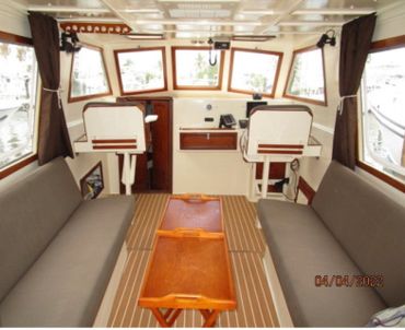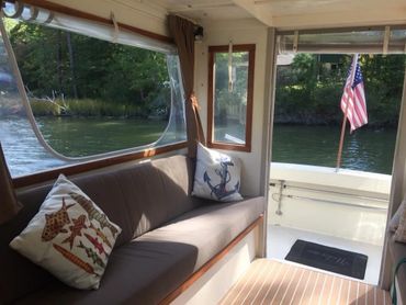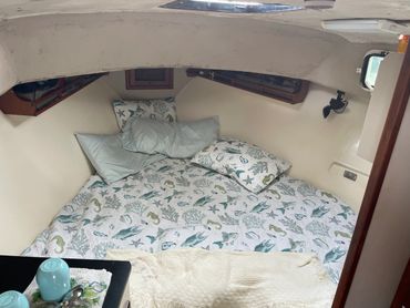 Mary Jo is a 1984 Albin 27 FC, customized in 2016 with an enclosed salon and open cockpit replacing the aft cabin. Mary Jo’s unique layout offers all weather comfort and versatility. The salon’s two six foot benches are perfect for entertaining and with upgraded mattress quality Sunbrella cushions, also for lounging or as an alternate berth with guests aboard or if you want to sleep in the open air. Windows and Strataglass offer 180 degree view, and with the rooftop AC / Heat, blackout curtains, screens and custom marine vinyl flooring. With her 9’8” beam the salon offers one of the largest living spaces of any boat under 30 feet.