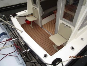 The forward cabin offers a dinette that easily converts to a full/queen size berth. It has an updated galley with a very efficient 12v fridge, a floor to ceiling pantry, and a sink with both hot and cold water. The in-line .05 micron water filter provides high quality drinking water is directly from the galley faucet! The wet bath includes a sink with a telescoping handle for hot water showers and a manual Raritan porcelain toilet with an expanded 20 gallon holding tank. The cockpit offers an additional outdoor living area with fresh water wash down/shower, two folding chairs and red LED cockpit lighting. Four rod holders have also been installed, perfect for trolling or storing a magma grill for your outdoor grilling adventures.